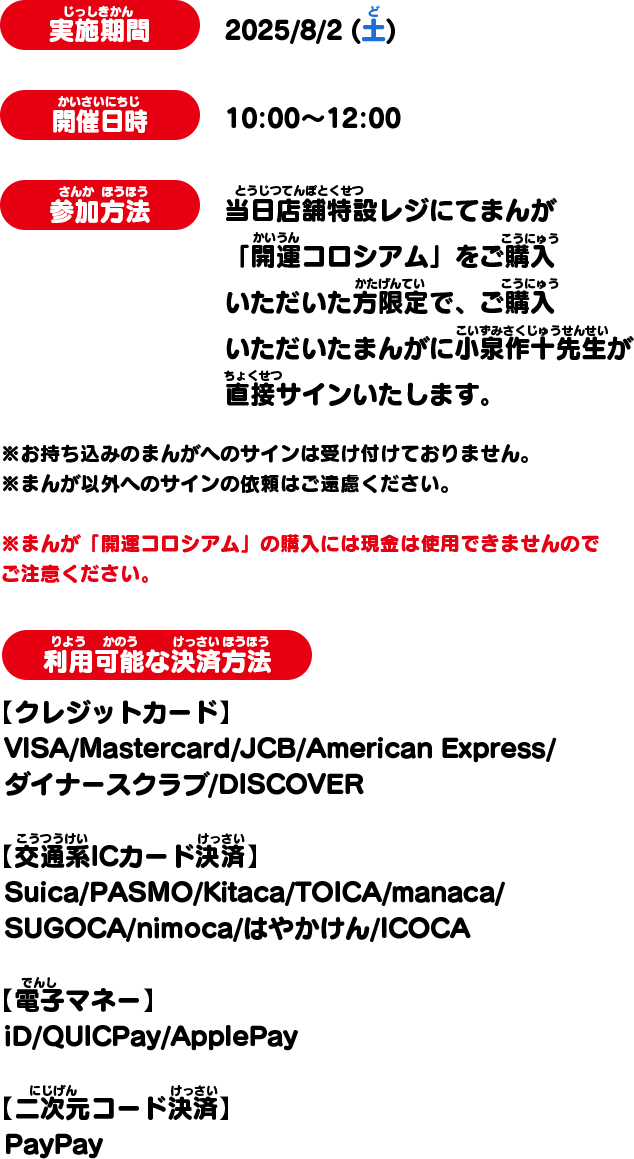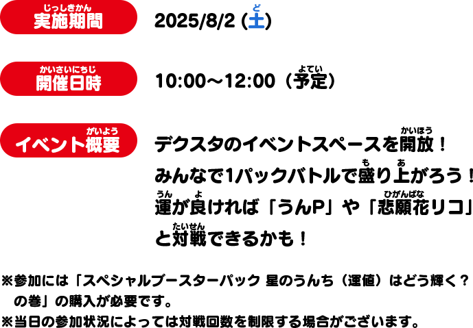 「開運コロシアム 第1巻」をご購入いただくと月間コロコロコミックでまんが「開運コロシアム」を連載している小泉作十先生サイン会に参加できるぞ!​さらに!1パックバトル対戦スペースも開放!​SP01弾で1パックバトルに挑戦だ!​