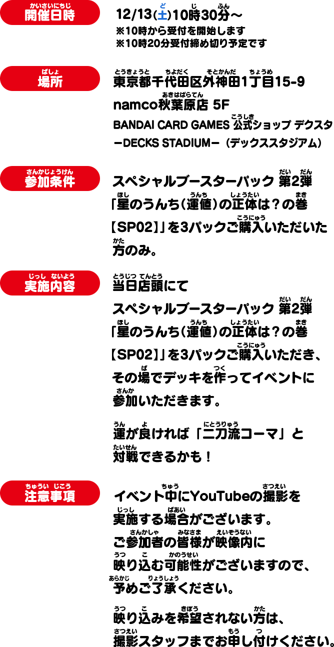 - ※必ず参加されるご本人様の『BANDAI TCG+』アカウントでご応募ください。代理応募は禁止です。